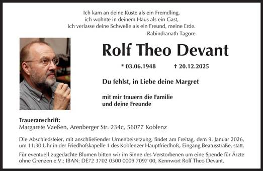 kurz vor Jahresende muss ich euch leider noch eine traurige Botschaft übermitteln. Unser Vereinsmitglied Rolf (Theo) Devant, geboren am 3.6.1948, ist am  am 20.12.2025 nach kurzer, schwerer Krankheit gestorben. Seine letzten 5 Tage hat er im Hospiz in Neuwied verbracht, wo er im Beisein seiner Frau Margret friedlich eingeschlafen ist. Wir trauern mit den Angehörigen und  seinen Freunden.